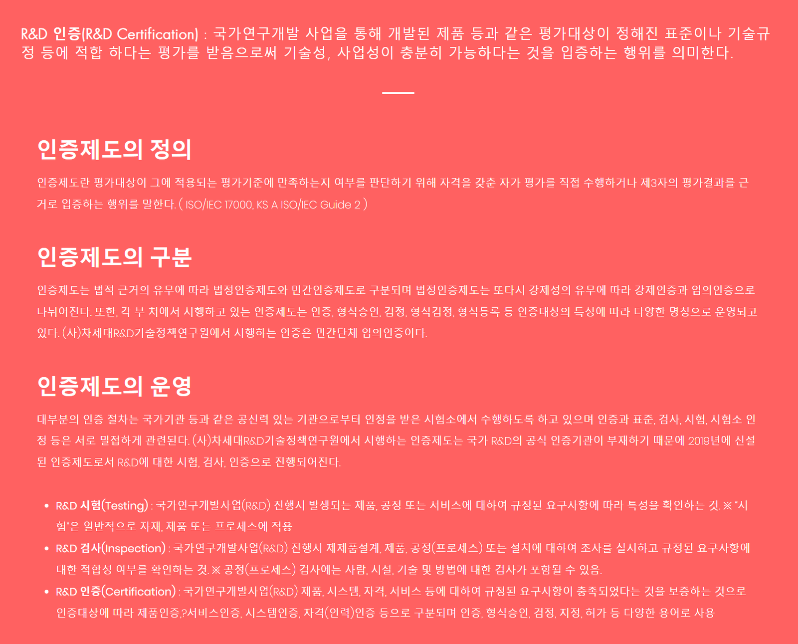 This study proposes a national R&D certification framework strategy aimed at strengthening R&D development capabilities and creating high value-added products and services through R&D innovation in response to next-generation core technologies. Based on the need for R&D certification, the methods of this paper used literature analysis and group in-depth interviews (FGI). The scope of this study was proposed around the intermediate results of R&D and the final output.